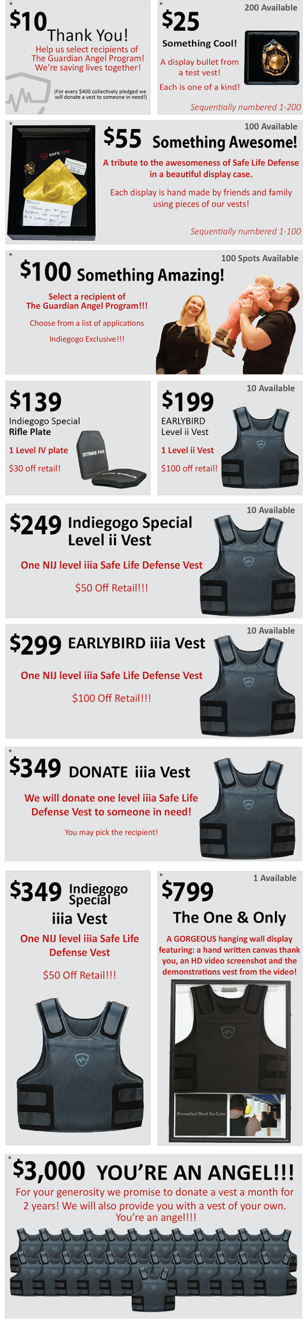 The Guardian Angel Program donates our high quality body armor to people in vital need of protection. We believe that no matter what, safety is what allows freedom in everyday life. For every $400 collectively pledged we promise to donate a vest to someone in need. In addition to these donations Safe Life Defense will always provide at least one vest a month. Pledging even a dollar makes a difference! Help save lives with Safe Life Defense and The Guardian Angel Program.